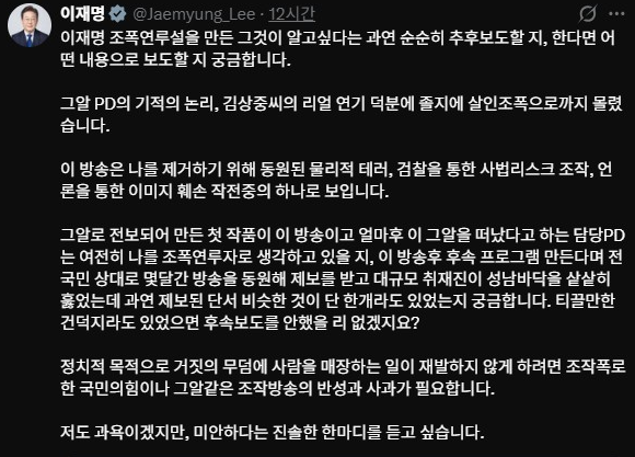 이재명 대통령은 자신의 SNS를 통해 해당 방송을 강하게 비판했다.